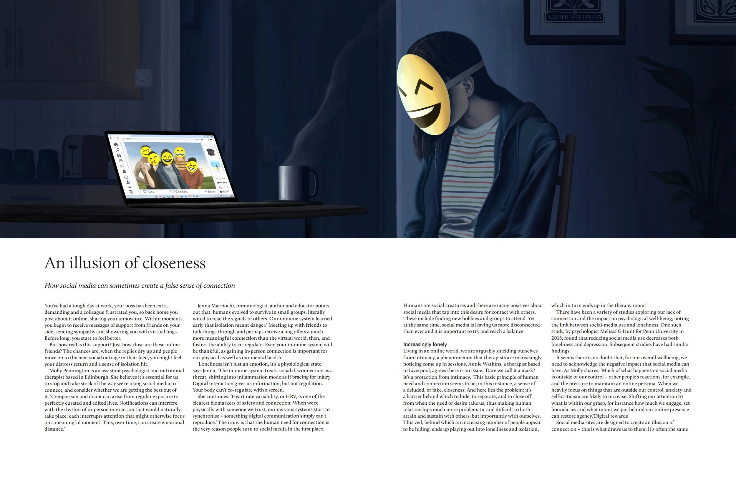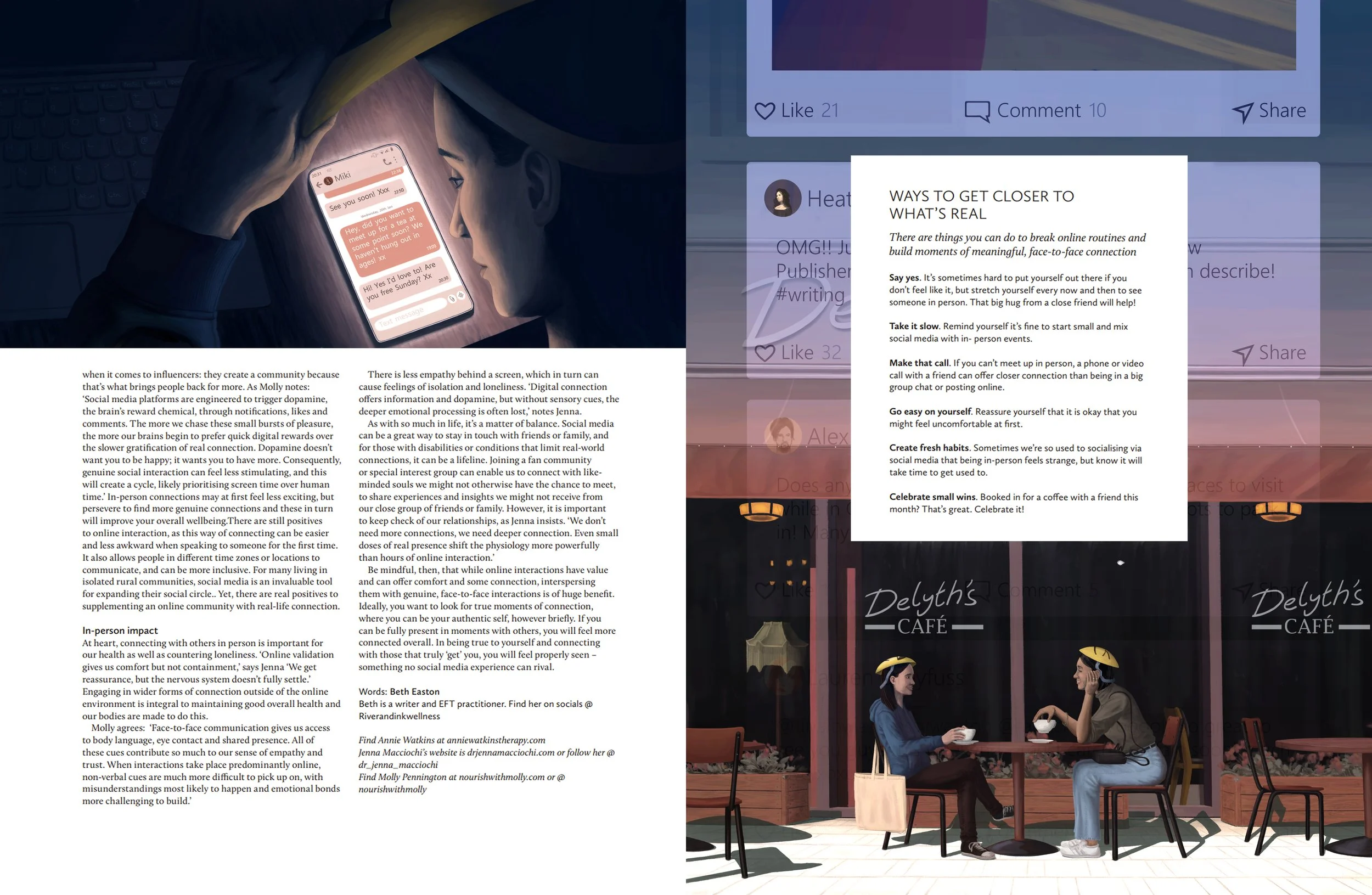 Illustrations for Issue 80 of Breathe Magazine, accompanying the written feature Missed connection by Beth Easton. The original title of the feature was An illusion of closeness (which is why that is the title in the above image), but was changed to Missed connection in the published magazine.